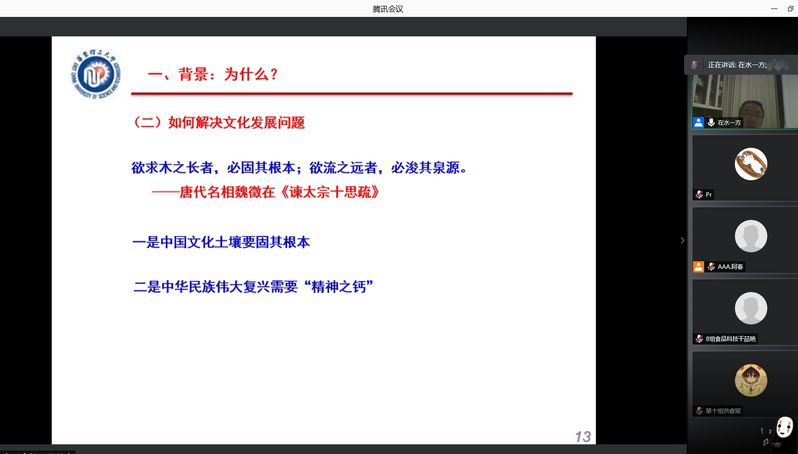 “文以载道,文以化人”。向云发从“什么是文化?什么是传统文化?”为导言,引出本堂课主题并进一步深入解读。一是从如何更好的解决“失语”、“挨骂”、“误解”的问题、如何解决文化发展问题、如何应对现实发展之困、如何回应时代之问出发,引出习近平对传统文化的重要论述并分析缘由。二是通过科学方法论分析,讲解了习近平通过唯物辩证地继承,创造性转化和创新性发展、以及既要反对教条主义、又要反对历史虚无主义、文化虚无主义等几个重要方面,阐述了对传统文化的传承与升华。三是讲述中国传统文化在实际的运用与发展过程中,主要表现为传统富民社会与全面建成小康社会、古代法治思想与建设社会主义法治国家、传统廉政文化与反腐倡廉建设、从古代丝绸之路到“一带一路”建设等几大方面。向云发深入地讲解了习近平对中华优秀传统文化的重要论述,进一步为同学们学习和理解中国的传统文化奠定了良好的基础。