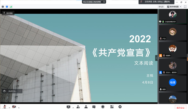 4月8日下午,welcome欢迎光临威尼斯公司第三期“云端品读 书香战疫”经典著作读书会以腾讯会议的形式顺利举行,学院2021级博士研究生王悦带领大家学习了《共产党宣言》(以下简称《宣言》),学院青年教师张九红受邀为学生答疑解惑。读书会由学院研究生会文艺部雷凯利主持,学院党委副书记杨倩、团委书记胡博成和硕博学生50余人参加。