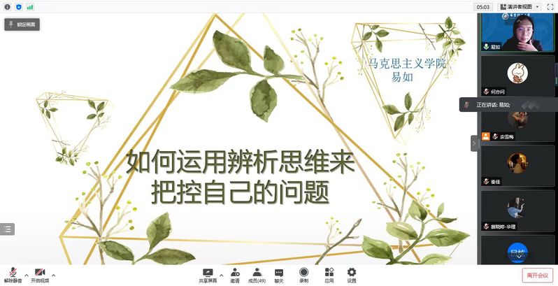 易如首先询问了同学们在疫情封控中的感受和存在的问题,强调要学会接纳自己的情绪。针对疫情的情绪困扰,她讲解了舆情的过度依赖、情绪的易激惹、过度移情和情绪的泛化四个方面的问题。随后,她提出了心理调适的具体策略,即运用批判性思维的八步法:认识问题、确定问题的边界、质疑假设、调整目标、分析弱点、制定方案、局限性意识和准备预案。她希望同学们能够在行为上谨慎小心,心理上积极乐观,在疫情中学会成长。在讲座过程中,易如与同学们积极互动,并针对他们心理上的困惑运用八步法进行了具体解答。