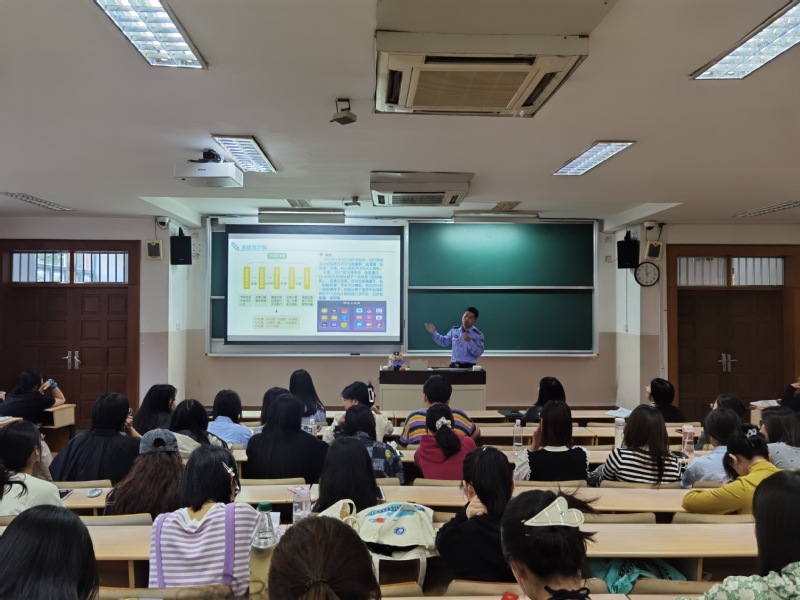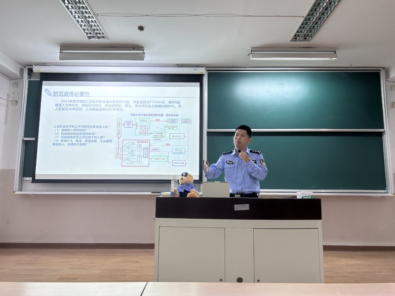 褚轶琛警官从自身办理的实际案件切入,重点讲解了网络诈骗的各种形式和防范技巧。他指出,高校学生因为缺乏社会经验,往往容易成为诈骗分子的目标。通过生动的案例分析,他帮助同学们深入了解了各种诈骗形式的作案过程和严重危害,提醒同学们在网络交易和社交过程中一定要保持高度警惕,增强自我防范意识,避免上当受骗。同时,他还介绍了日常安全、消防安全、国家安全等问题,提醒同学们一定要严格遵守法律法规、校纪校规,做一名遵纪守法的大学生。