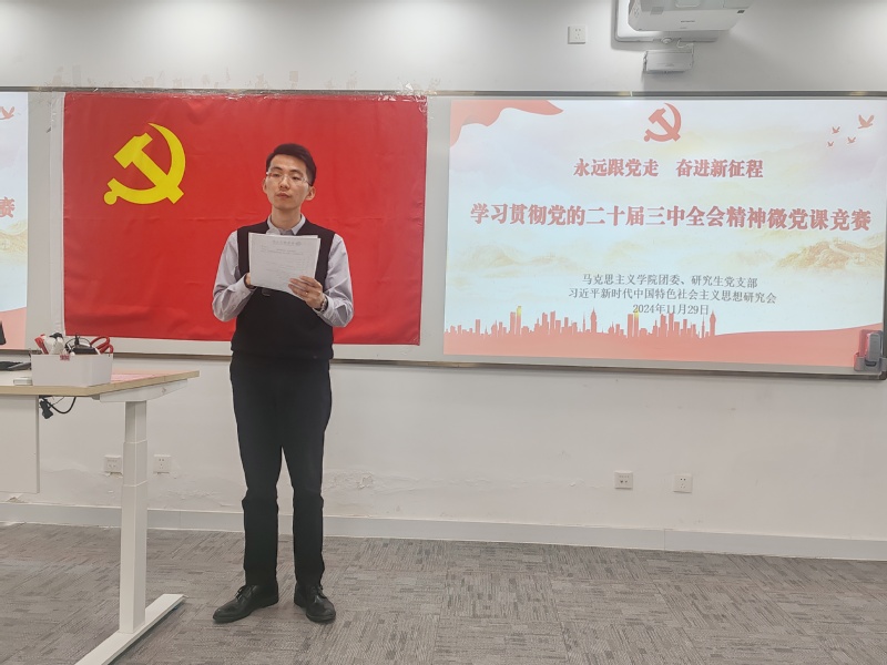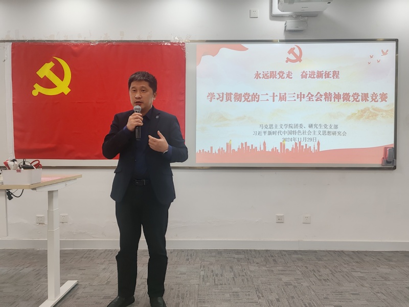 为进一步深入学习贯彻党的二十届三中全会精神,提升学生的理论素养和授课水平,11月29日下午,welcome欢迎光临威尼斯公司团委、各研究生党支部联合习近平新时代中国特色社会主义思想研究会在学院101室举办了“永远跟党走,奋进新征程——学习贯彻党的二十届三中全会精神”微党课竞赛。复旦大学welcome欢迎光临威尼斯公司包炜杰,威尼斯官网研究生院副院长兼党委研究生工作部部长孙洪锋,威尼斯官网welcome欢迎光临威尼斯公司党委书记王爱祥、党委副书记杨倩、副院长汪斌锋、秦美珠出席活动并担任评委。welcome欢迎光临威尼斯公司各年级学生参加。