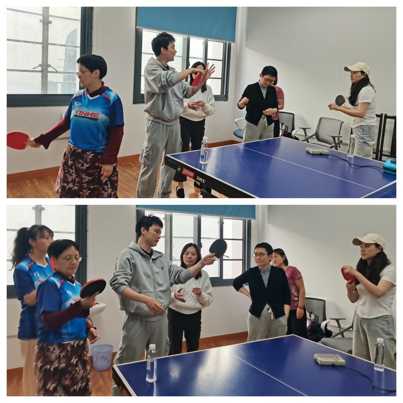 成立仪式结束后,马院乒乓球队在学院201工会活动室开展了首场集训活动。教练团队通过趣味热身、基础动作教学和发球机专项训练,让教职工们在挥拍切磋中感受运动魅力。