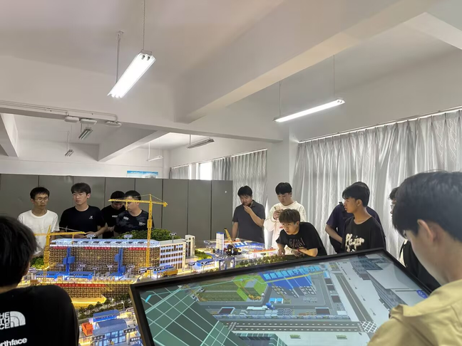在明尚楼204教室,开展了智慧工地的前沿展示与交互式教学。通过智慧工地AR固态沙盘,学生借助特定设备实时查看工地关键数据,体验AR技术对施工现场管理的赋能,并在智慧工地数字教学沙盘上操作高度仿真系统,体验智慧工地规划与监控。