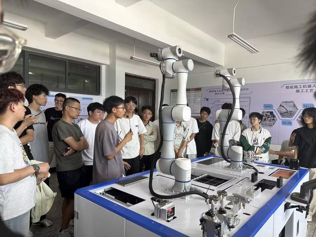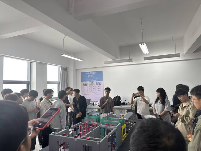 午后的实训交流环节由张凤婷老师负责。在明尚楼202教室,师生们聚焦施工自动化与装配式建造的深度模拟,亲手操作六轴双臂施工模拟机器综合平台,深化对未来 “无人化” 或 “少人化” 施工现场的理解,还沉浸式体验了装配式建筑工程 IDT 拟态实战演练系统,了解装配式建造的核心技术要点。