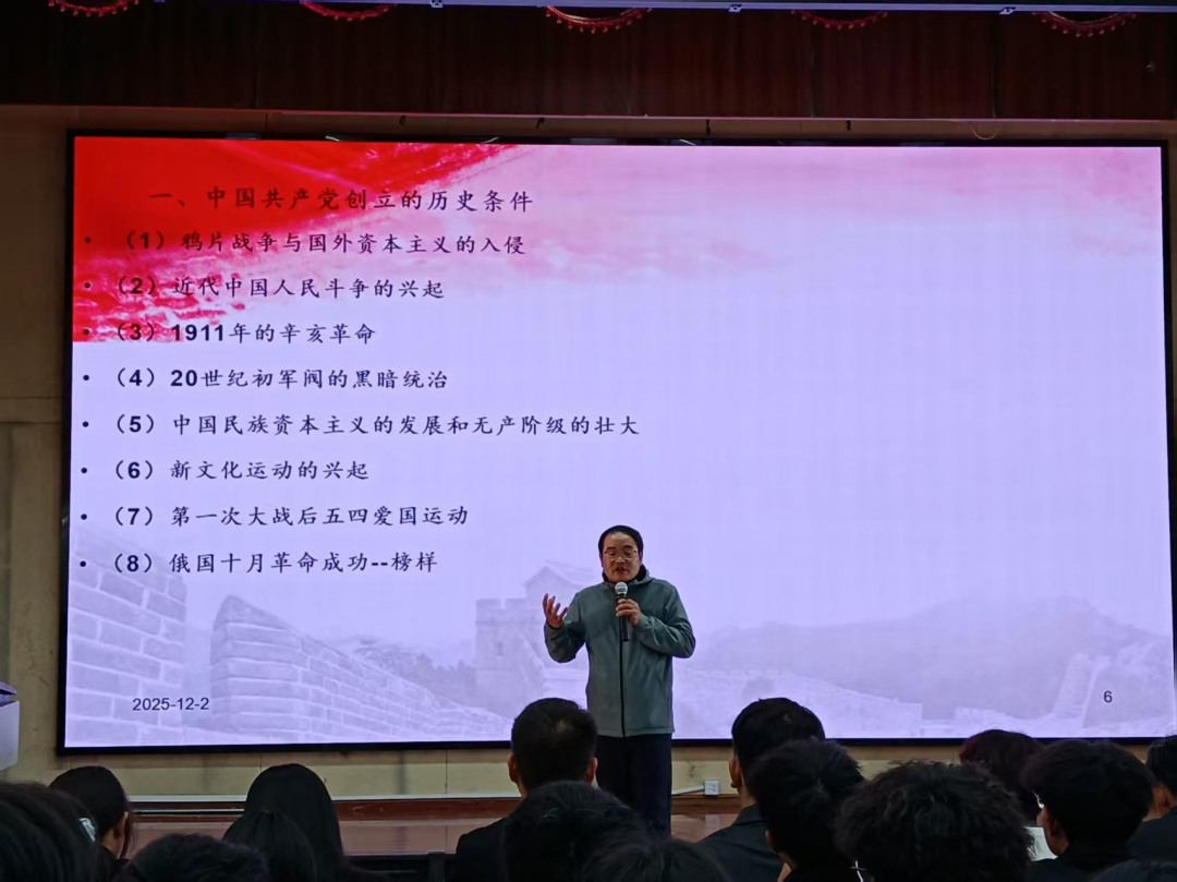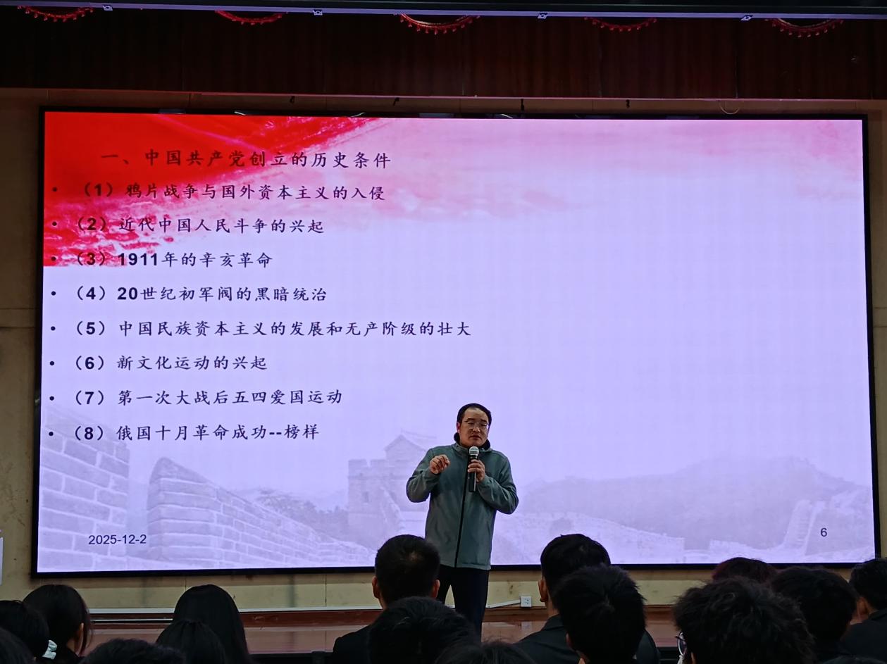 讲座伊始,李洪香书记以时间为脉络,带领在场同学重温了中国共产党自诞生以来,历经风雨、砥砺前行的百年奋斗征程。从嘉兴南湖的红船启航,到新民主主义革命的烽火岁月;从社会主义建设的艰辛探索,到新时代中国特色社会主义的伟大成就。他用一个个鲜活的历史故事、一组组详实的发展数据,生动勾勒出党带领人民攻坚克难、走向辉煌的壮阔图景。
