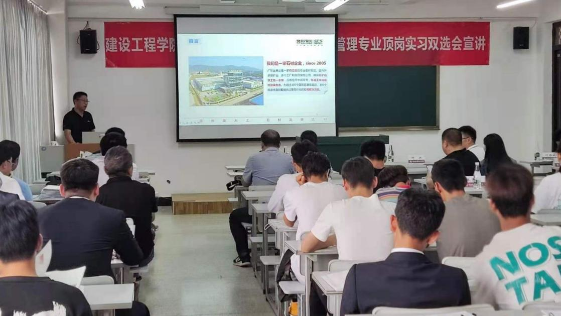 当日,在明尚楼C308教室还举行了2019级建筑材料生产与管理专业顶岗实习双选会,共100余名同学参加双选会,来自江苏南通石材协会、广东云浮石材商会的27家企业,对顶岗实习学生的就业前景做了详细的分析,通过ppt的讲解下,让同学们分别从主要工作、工作对象、工作范围、薪资待遇、福利、业余生活等多方面进行了解。也希望同学们树立正确的就业价值取向,积极准备,主动寻求就业机会,顺利找到满意的工作。