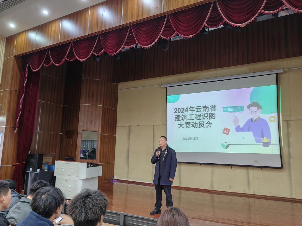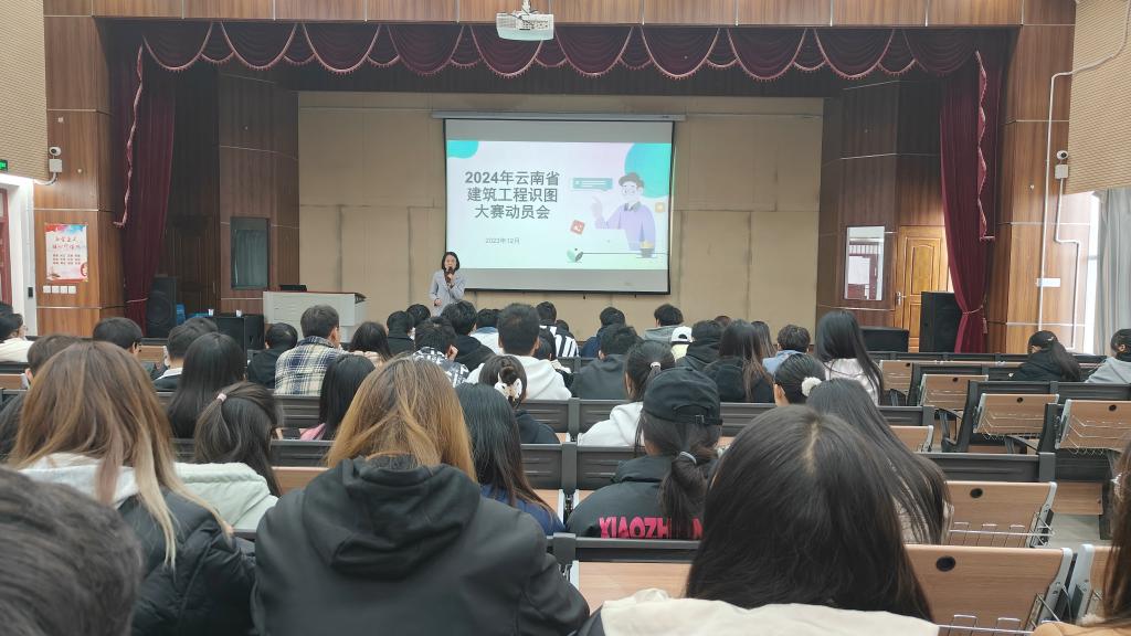 2023年12月8日中午,今年会官网在光荣讲堂召开2024年云南省建筑工程识图大赛赛项动员大会,今年会官网院长彭明兴,党总支副书记李洪香,专职教师潘少红、刘晖、赵岩枫,中望软件公司总监刘宇航以及2022级工程造价、建筑经济信息化管理和建设工程管理专业的学生参加动员大会。