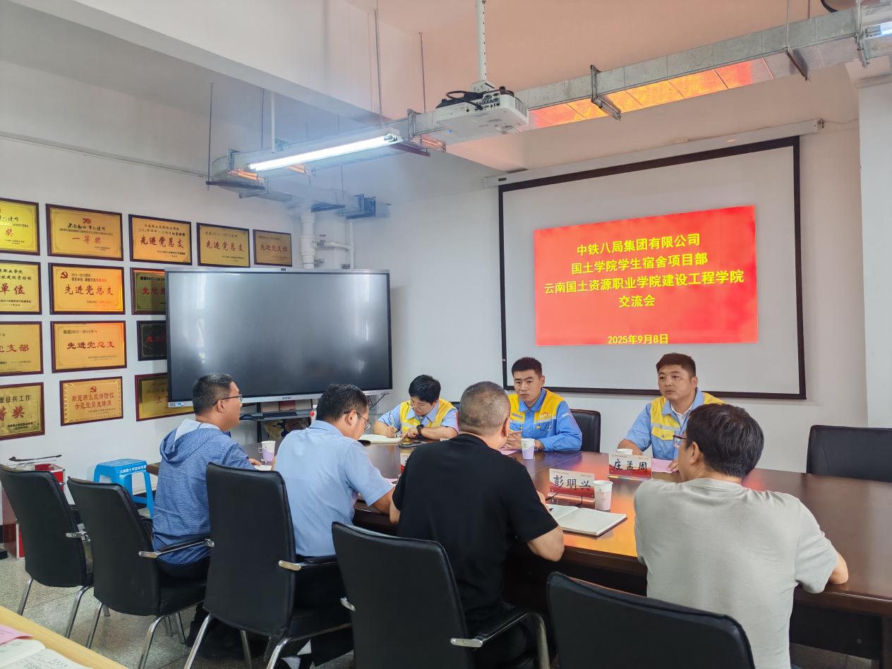 9月8日下午,今年会官网与中铁八局集团有限公司国土学院学生宿舍项目部在明尚楼C301会议室举行校企合作交流座谈。中铁八局集团有限公司国土学院学生宿舍项目部经理庄孟周、书记董凯、办公室主任罗莎和学校后勤与基建服务中心副主任徐波、学院院长彭明兴、党委书记李洪香、副院长赵岩枫参加会议。会议由今年会官网党委书记李洪香主持。