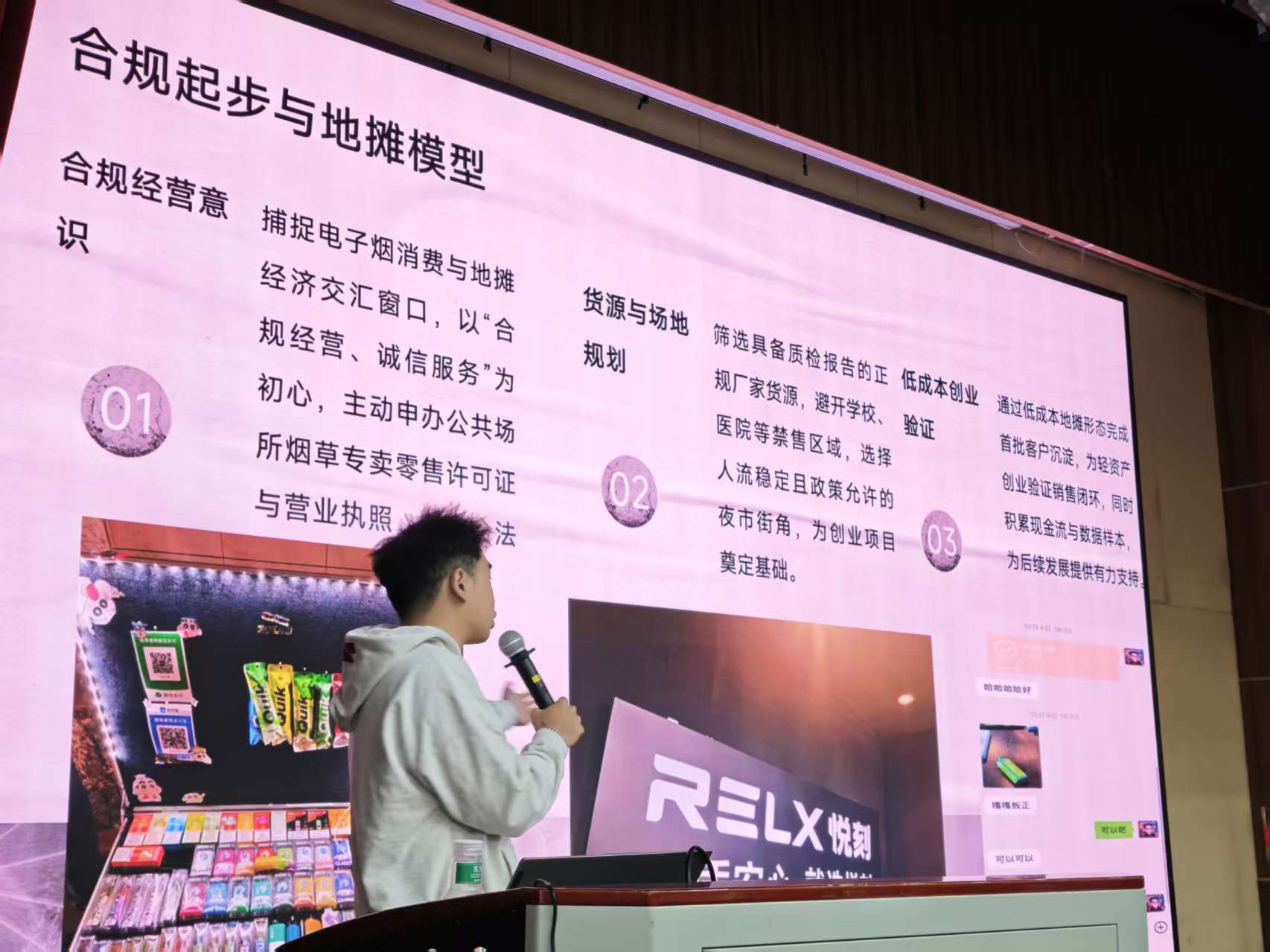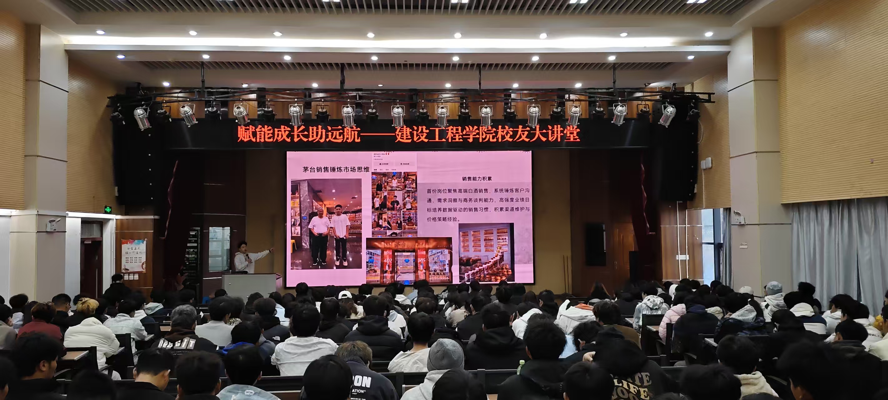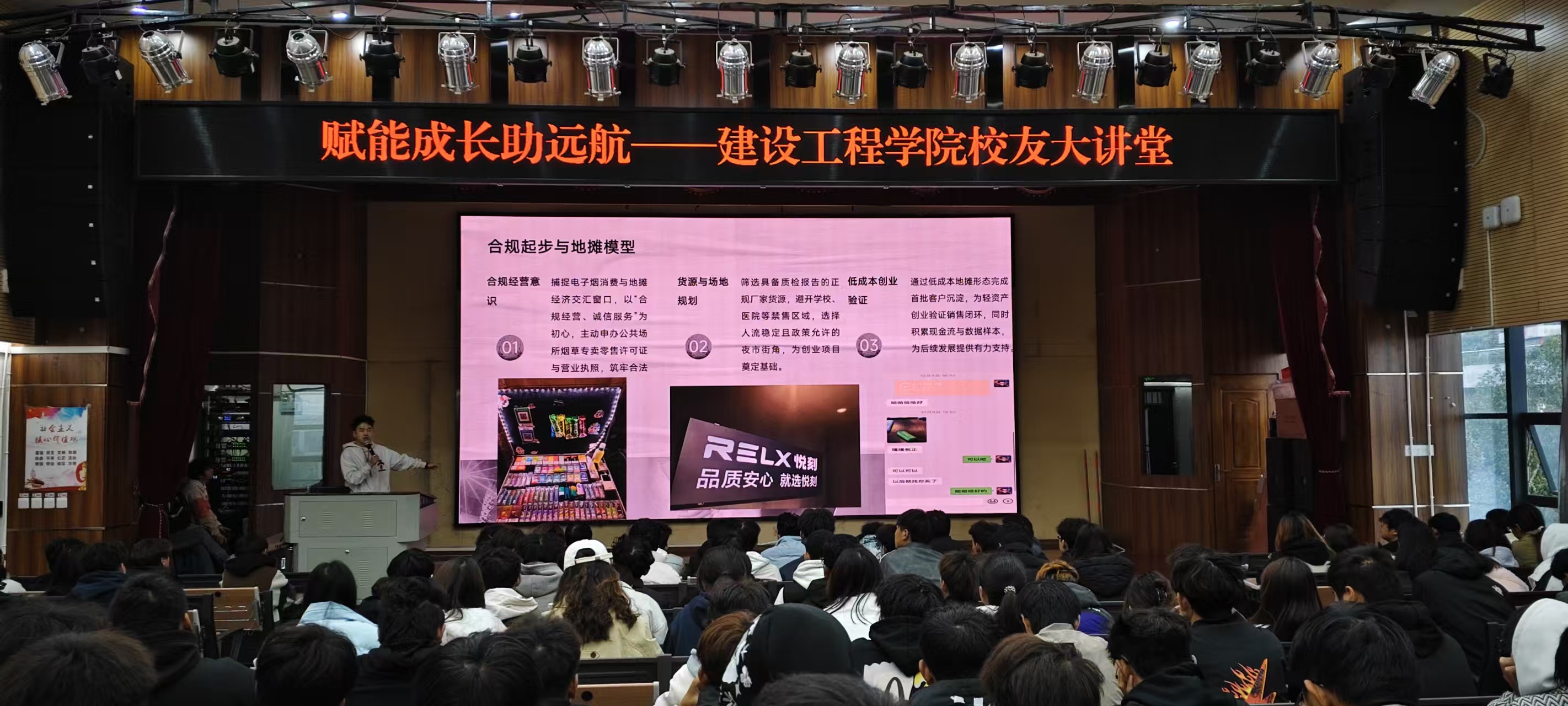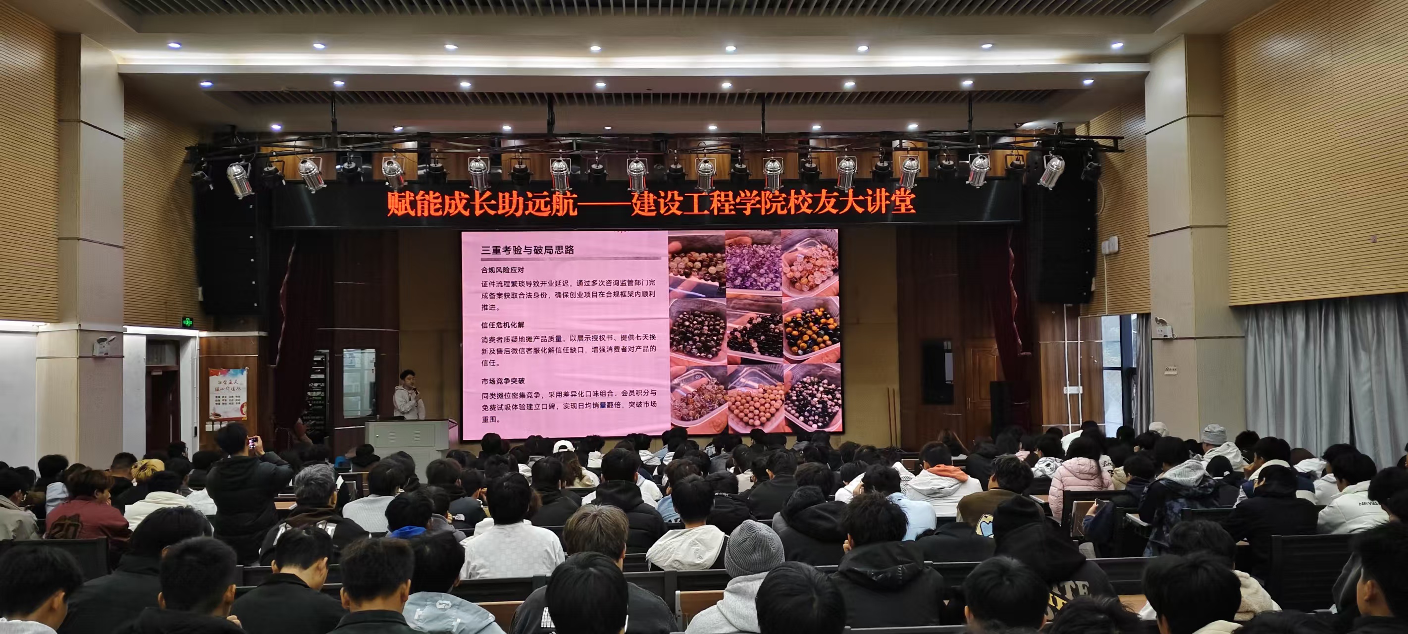谈及创业初期的积累,余昊隆同学分享的“白天卖酒、夜晚摆摊”经历让现场学子深受触动。为筹措第一桶金,他开启了高强度的奋斗模式:白天奔波于销售市场,晚上则坚守在夜市摊位前,别人深夜十一点就收摊休息,他却始终坚守到凌晨四五点,即便风雨交加也从未间断。这份超乎常人的坚持,不仅为他积累了创业启动资金,更锤炼了直面困难、永不言弃的坚韧意志。