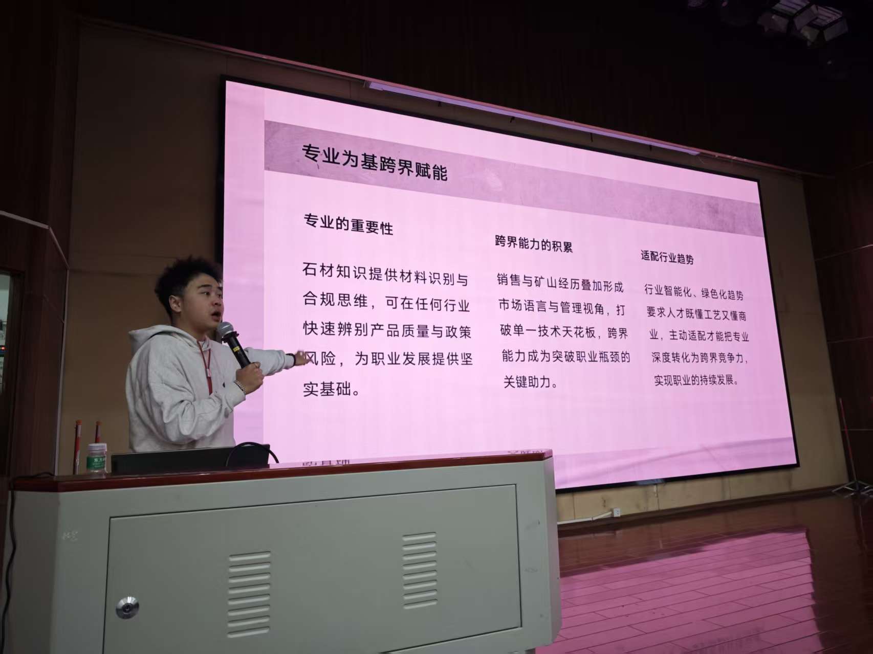 “大学时光是人生最宝贵的积累期,每一分投入都会在未来收获回报。”余昊隆同学开篇便分享了自己的校园成长心得。大学期间,他始终以严谨务实的态度深耕专业领域,在石材鉴别、矿山规划等核心课程中潜心钻研,反复打磨理论知识体系;课余时间,他主动加入学生会,在组织活动、协调沟通的实践中锤炼管理能力与团队协作意识,为后续跨界发展筑牢了坚实的综合素养根基。