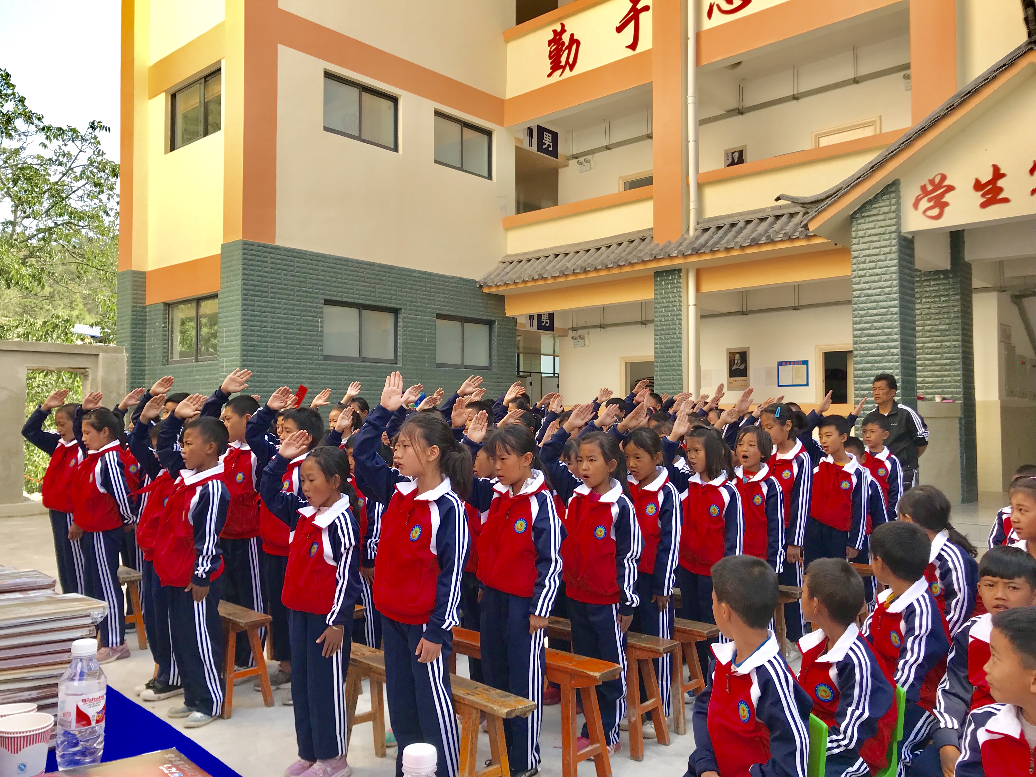 上午10点,庆祝活动开始,同学们穿着新校服,高高兴兴、整整齐齐地列好队迎接各位嘉宾和老师入座。