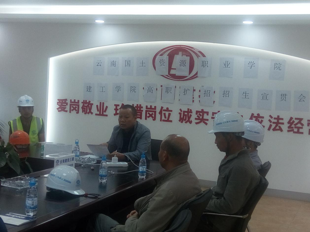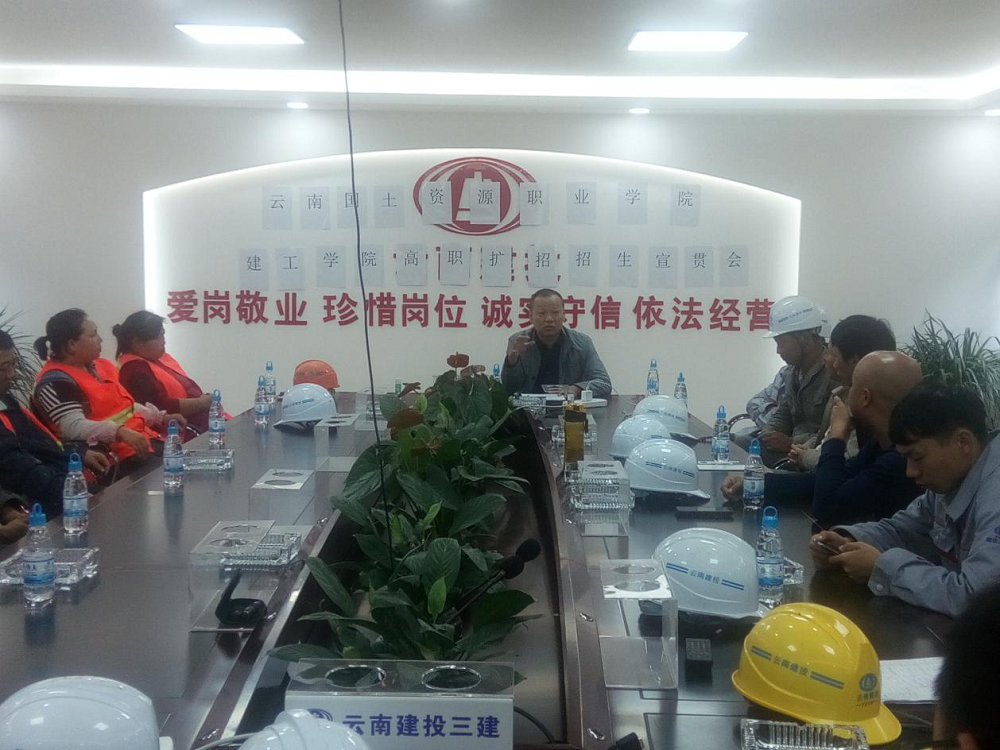 9月12日上午9点,国土今年会官网与云南建投第三建设有限公司第一项目经理部在工程部会议室召开“高职扩招招生宣传会”。云南省建投第三建设有限公司项目部王经理,今年会jinnianhuicom今年会官网院长彭明兴、建筑经济管理教研室朱磊老师出席,20名企业工人代表共同参会。会议由项目部王经理主持。