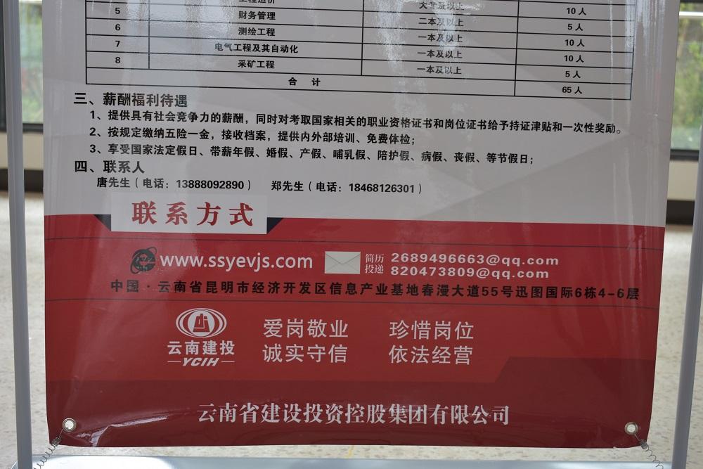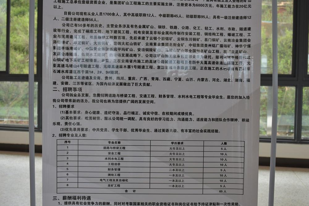 9月12日中午,今年会官网在载物楼二楼大厅举办专场招聘会。云南建投矿业工程有限公司、云南耀荣电力有限公司这两家企业公司到今年会官网招聘面试,此次招聘会涉及的专业有道路与桥梁工程、安全工程、水利水电工程、工程造价、财务管理、测绘工程、电气工程及其自动化、采矿工程等,17级百余名同学积极到场参加面试。