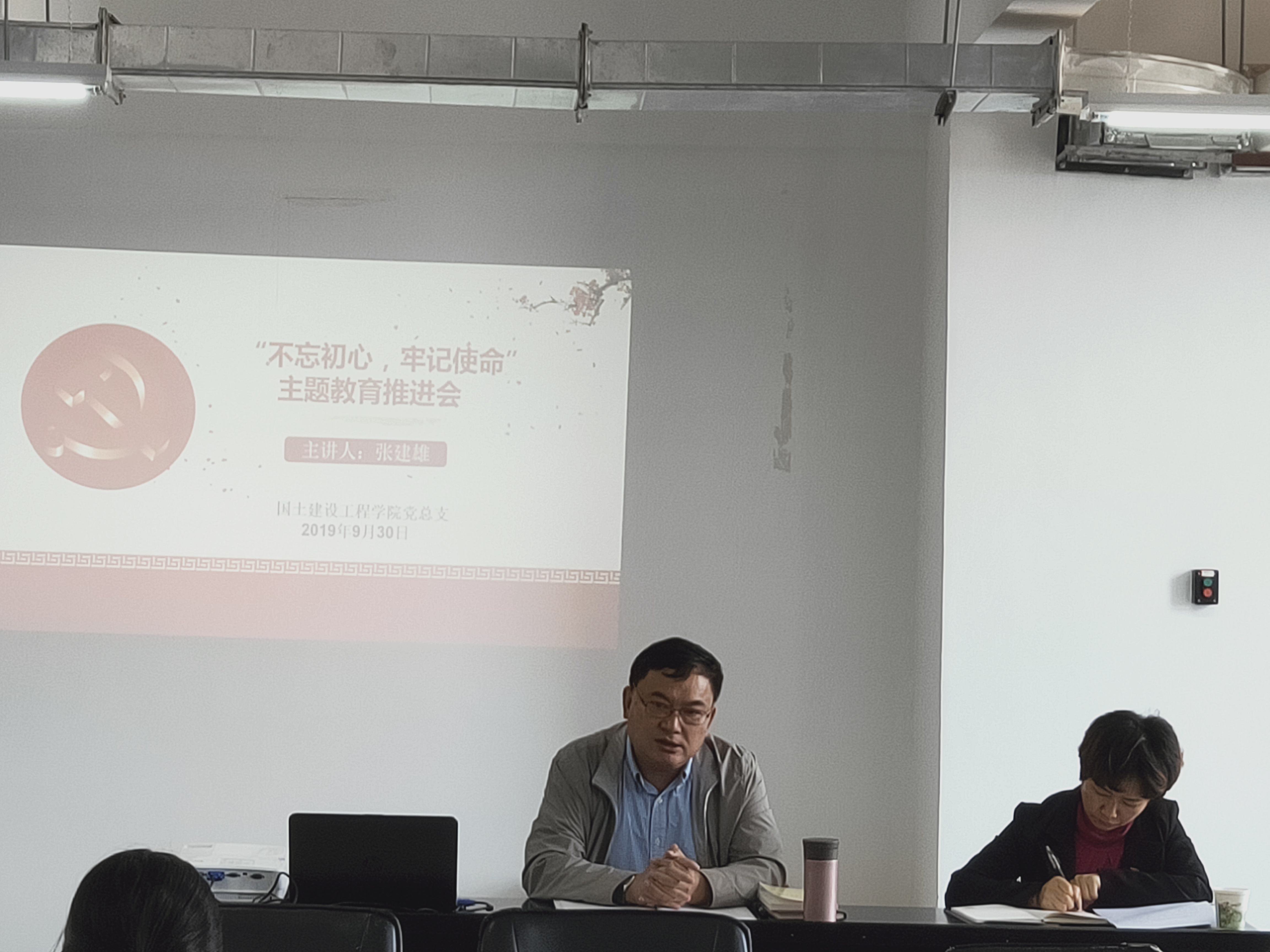 9月30日中午1点,国土今年会官网党总支在明尚楼C301开展“不忘初心、 牢记使命”主题教育推进会,会议由张建雄校长宣讲,党总支书记高昆主持,总支全体35名党员共同参会。
