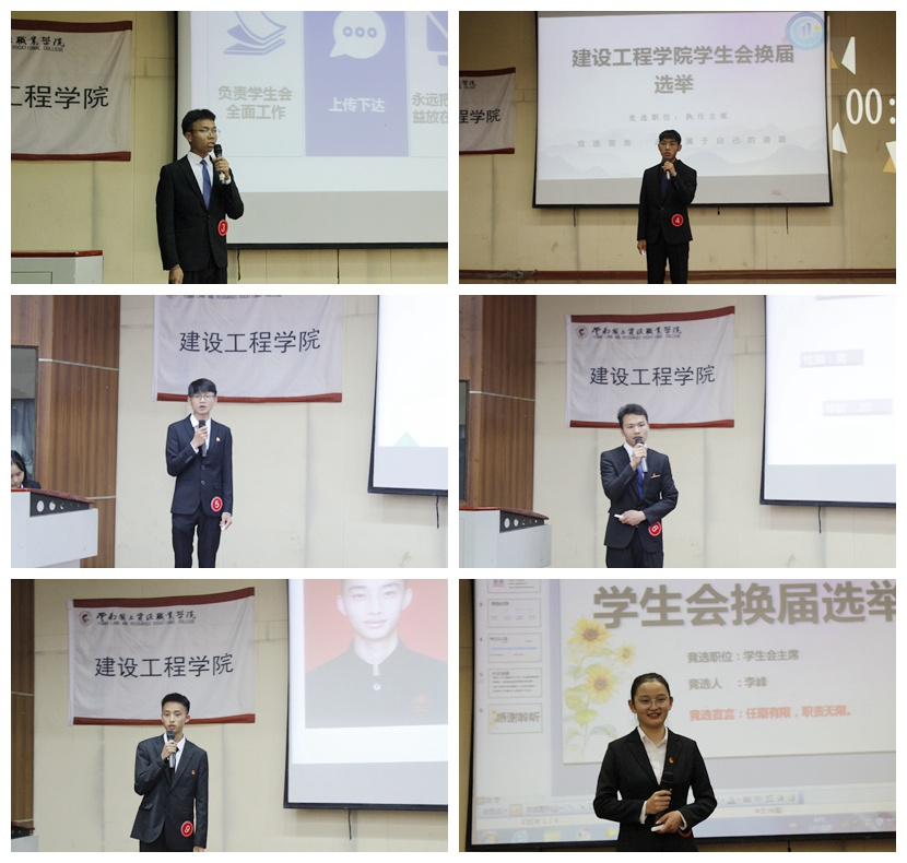 来自各部门的学生会的12名干事,充分展现自身的风采,竞选主席团成员、团总支副书记。各选手依次上台竞聘从自我介绍、岗位认知、竞聘优势、工作计划四个主要方面进行了竞选演讲,充分展示自我,强烈的表达了自己服务老师、服务同学的意愿。各教师评委针对选手的演讲提出问题,各选手悉心全面进行答复,赢得场下阵阵掌声。