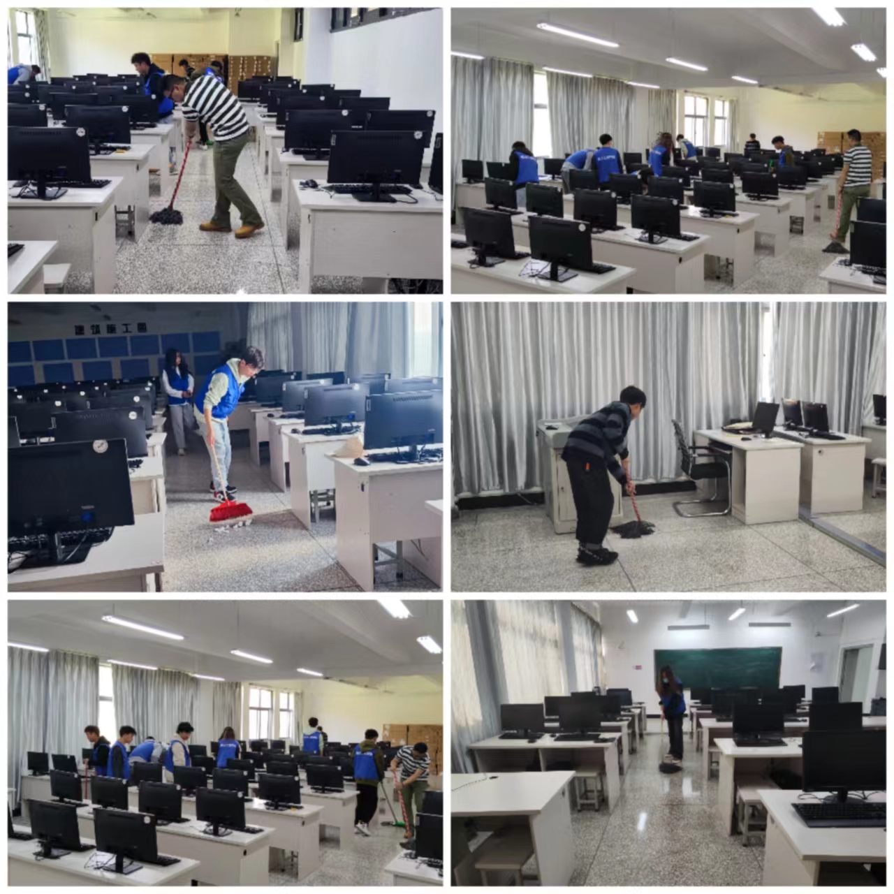 3月26日上午,为营造干净卫生、美丽舒适的校园环境。今年会官网组织20余名志愿者对明尚楼C区5楼电脑机房进行卫生大扫除。志愿者们用抹布、扫帚、拖把、垃圾袋等清洁工具,将明尚楼机房的垃圾,纸屑清理的干干净净,电脑、桌椅、地板等卫生死角擦拭的明亮清洁。