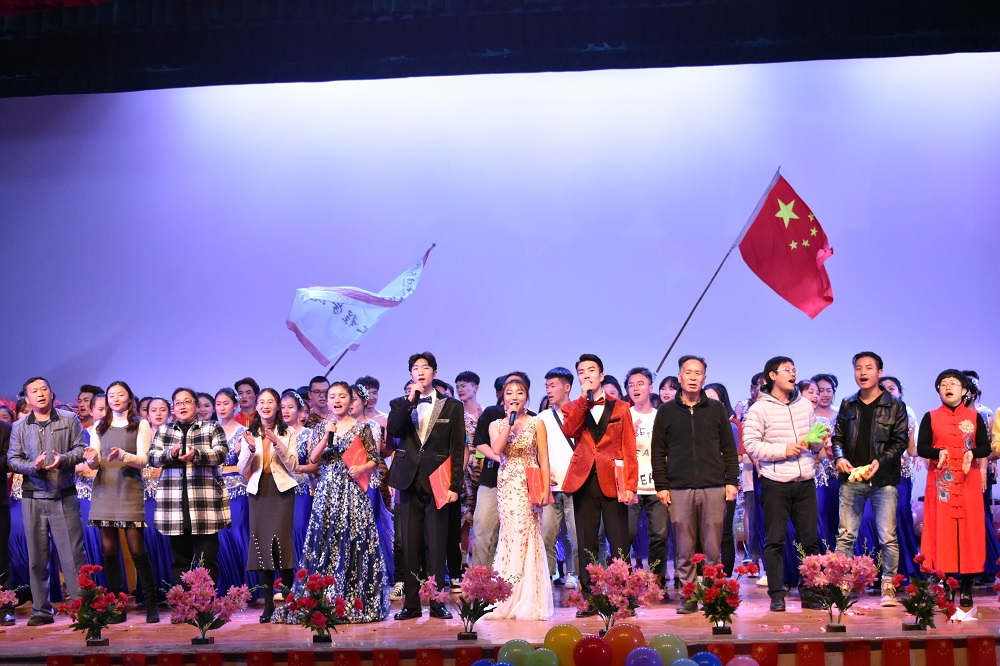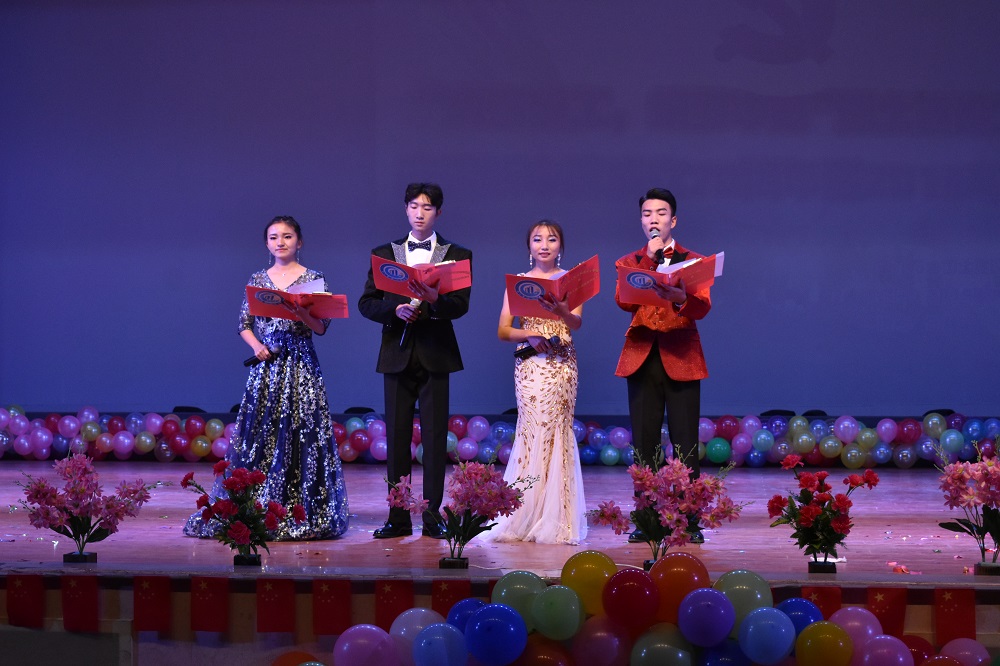 本次晚会共八项议程。伴随着旗兵们铿锵有力的步伐,鲜艳的五星红旗展现在我们的眼前,全体师生庄严肃穆奏唱国歌。接着,高昆老师致辞:首先对到场的领导、各二级学院学生代表和嘉宾们能来到晚会现场表示由衷的感谢。她指出,70周年的荣耀,属于我们伟大的中国共产党,属于社会主义新中国,属于共创辉煌的13亿中华儿女。我校走过60年的风雨,有多少感动,有多少荣光,有多少梦想,有多少辉煌,都凝聚在每一个学生的心里,今天是一个值得铭记和纪念的日子,此刻我们欢聚于此,用国土人特有的形式庆祝新中国成立70周年,同时展迎迎新晚会的到来,并祝愿在场的所有教师和学生度过一个美好的夜晚,预祝晚会圆满举行。