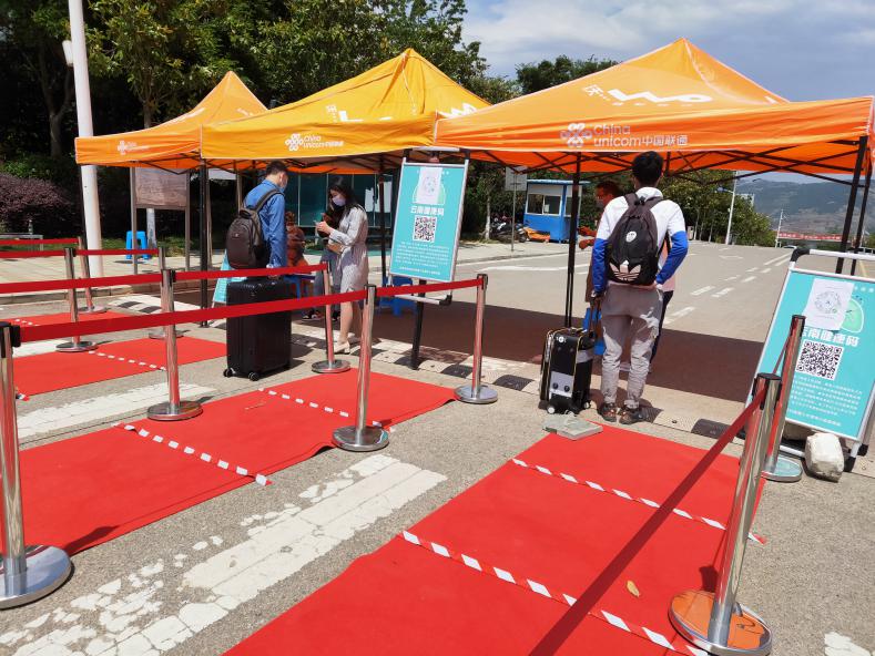如果你坐校车入校无需扫码直接进校?——这是不可能的,一大波工作人员在观山楼校车点等你,扫码入校。如下图